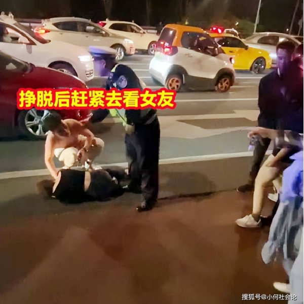 就这样,女子靠一双手一张嘴将情侣给制服了,而男生的衣服也在拉扯中被撕成了碎片。
