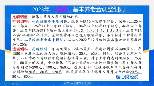 比如说山东省的养老金调整方案:定额调整每人每月增加41元;按缴费年限调整,是根据不同的缴费年限长短分别增加1.2元、1.4元、1.6元、1.8元和2.0元;按养老金水平增加,是增加本人基本养老金的1.25%。对于年满70周岁不满75周岁、年满75周岁不满80周岁和年满80周岁以上的老人,额外增加基本养老金15元、30元和60元。另外,还有对上年度内年满70周岁,75周岁和80周岁老人的额外养老金增加。