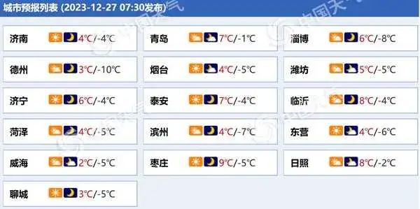 到了明天,山东全省的天气将转为多云转多云,北风转南风3级左右。最高气温:鲁西北预计在3℃左右,鲁南地区预计在7℃左右,其他地区预计在5℃左右。夜间最低气温:鲁西北预计在﹣7℃左右,沿海地区预计在﹣1℃左右,其他地区预计在﹣3℃左右。