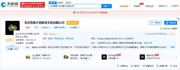 2022年4月14日,北京冬奥结束不到2个月,"香蕉体育"公司,注销了!