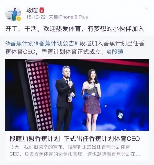 2015年12月22日,王思聪的香蕉计划公司发布公告,宣布段暄出任体育公司CEO,负责香蕉体育的运营和管理。