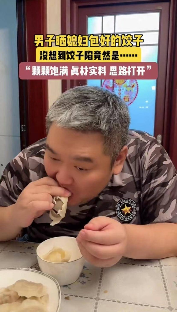 男子一连吃了几个饺子,觉着还挺好吃,冲着媳妇竖起大拇指:老婆,你可真聪明,包饺子算是打开了新思路!