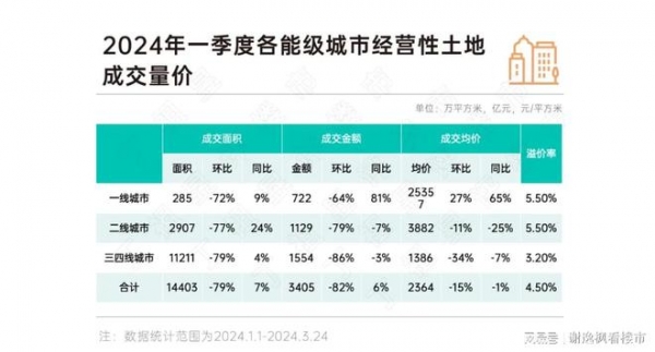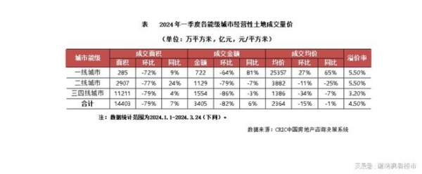 四是土地成交下降。克尔瑞数据显示,2024年一季度全国300城经营性土地成交建筑面积1.44亿平方米,同比来看,受2023年预供地延迟入市低基数的影响,同比上涨7%,环比下降79%。其中一线楼板价同比大涨65%,二线同比下降25%。