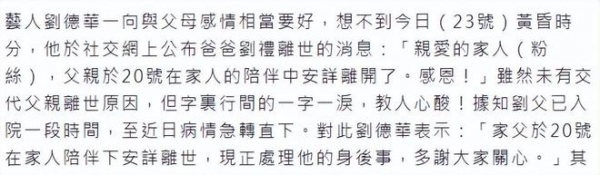 媒体连线刘德华,也证实了父亲去世的噩耗,当下他正忙着处理父亲的后事,谢谢大家的关心。