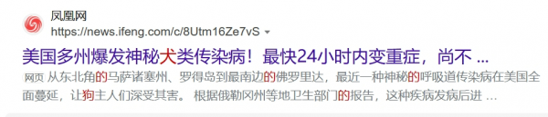 当时国内不少媒体转述了相关报道。根据美国俄勒冈州等地卫生部门的报告,这种疾病发病后进展很快,最快只需24小时就能从咳嗽转化成肺炎,并且已经出现死亡病例。而且普通的呼吸道检测查不出这种新型疾病,结果往往呈阴性。患上这种疾病的狗,主要症状是咳嗽、打喷嚏、流鼻涕、流眼泪以及嗜睡,有些狗在24小时到36小时内变为重症。