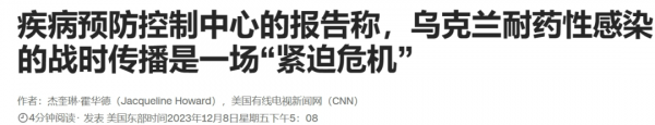 当地时间12月8日,美国疾病控制与预防中心(CDC)报告:抗菌素耐药细菌在乌克兰变得越来越普遍,并正在与乌克兰难民一起进入欧洲。美国有线电视网甚至用了"紧迫危机"来描述此事。