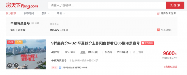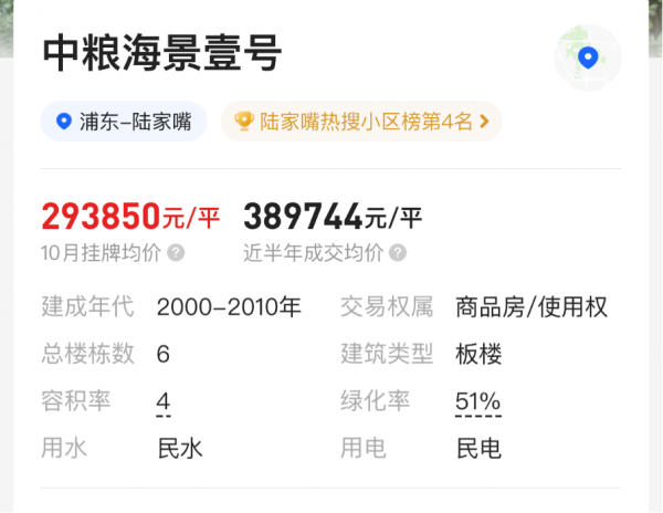 上海鹏利名下的资产,是三栋占据上海陆家嘴最核心位置的豪华住宅--中粮海景壹号,这个项目在中介市场挂牌的单价十分惊人,均价高达293850元/平方米。