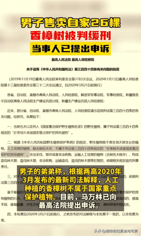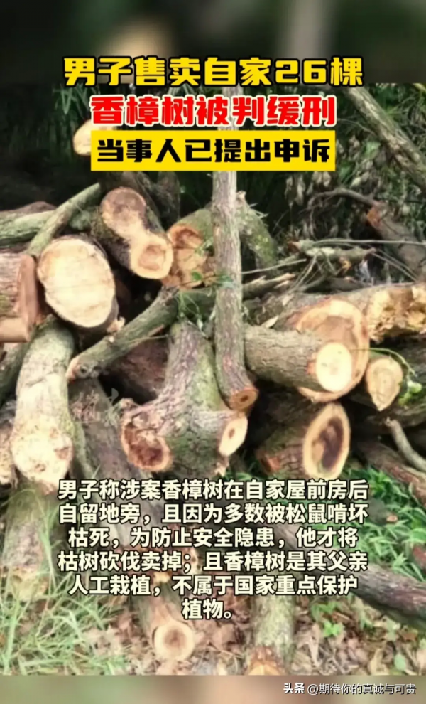 近日,四川泸州叙永县一男子因将自家26棵香樟树卖给他人,被法院判决犯非法出售国家重点保护植物罪,判处有期徒刑两年,缓刑三年。该男子已提出申诉,称香樟树为自家种植,不属于国家重点保护植物,且因多数树木被松鼠啃坏枯死,为防止安全隐患才进行出售。