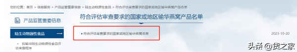 海关总署官网→进出口食品安全局→信息服务→产品监管重要信息→陆生动物源性食品→符合评估审查要求的国家或地区输华燕窝产品名单