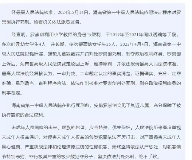 海南海口,一名小学男教师在3年的时间里,多次性侵女学生,并长期猥亵女学生,事发后,这名男教师被抓获归案,经法院审理后判处其死刑立即执行,最高院复核后,男教师被依法执行了死刑。