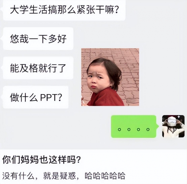 而当家长知晓学生的学习压力较大时,也忍不住替学生出主意,"能及格就行了呗,做啥PPT",估计大学生也很无奈吧,这真是亲妈呀!但光及格可不行,学生还要努力拿奖学金呢呀!