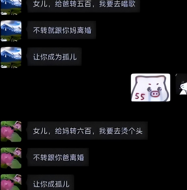 而在看大学生晒和父母聊天记录,老爸要500元,老妈要600元,不给转就"离婚",学生:你们礼貌吗?合着你俩吵架受伤害的却是我的钱包呗!