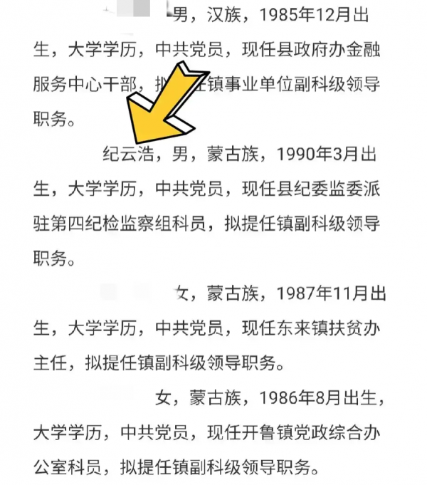 而纪云浩被提拔公示的上,官方写的是纪云浩,为大学学历,一般来说,大学学历默认是大学本科四年全日制的,如果不注明的话,是函授大学或者非全日制,要注明在职大学的。