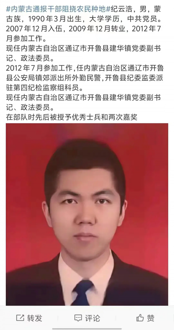最近,云浩止耕登上热搜的。建华镇党委副书记纪云浩,他在"不交钱不让种地"事件中的强硬态度让他在全国范围内引起关注。