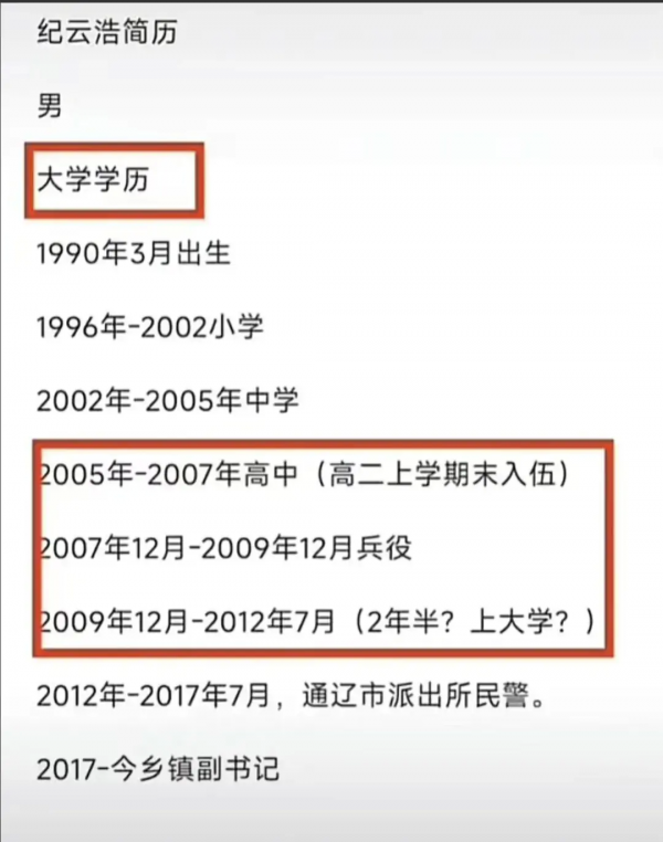 然而我们发现纪云浩副书记2009年12月退伍就转业,2012年7月派出所民警,那么他在这两年半干了什么,回去上大学吗?难道去读了三年的全日制大专吗?或者纪云浩副书记16岁上大学,是一个天才少年,17岁当兵,回去再读两年就能毕业了。