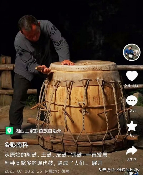在彭南科最新发布的短视频中,他用十几分钟的时间,分上下两集,详细展示了"鼓"从牛皮取鼓面到制木腔、断料、划线、锯板、理板、烘干、堆放等数十道传统制作工艺。