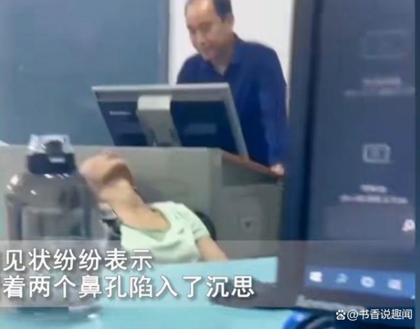大家心照不宣,老师似乎没有察觉,还在专注地把弄着他的电脑。突然,老师觉察到了一点异常,转头看向了讲台外,一时间看到仰着脑袋露出两个大鼻孔的女生,一下子就懵了,陷入了沉思。
