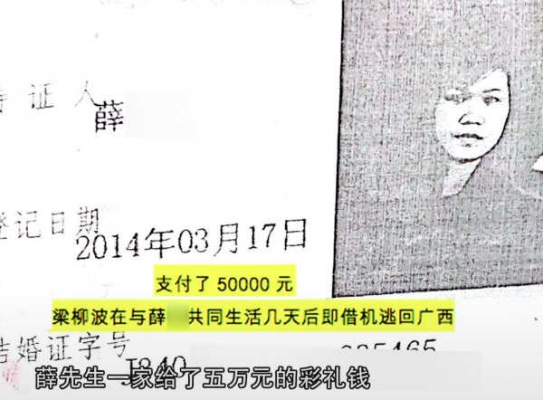 她与河南的薛先生结婚,收取彩礼50000元,同居几天就跑了。