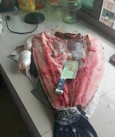 男人买回大鱼准备下锅,在切鱼头的时切到一个非常坚固物体,菜刀都切缺了一个口儿,男子赶紧住手了。