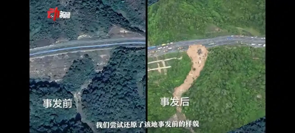 我们先来看一看,塌方前后的卫星图,能够明显看到塌方区域在塌方前跟周边地貌有区别,周边都是高大茂密的林木,而塌方区域在塌方前就是比较光秃的,没有较大和茂密的树木。树木的根对水土保持是固定作用的,为什么这一区域没有树木,说明他的地貌、地形或者土质跟周边是有区别的。我们再来看下一张图。