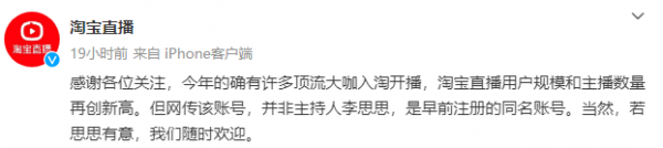 随后,也有她要带货的消息传出,对此,淘宝官方也发文回应,否认李思思将要以私人的名义带货。