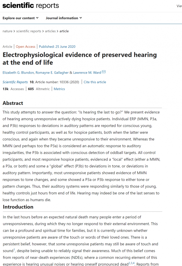其实更准确的说《科学报道》上说的是垂死临终关怀的状态,如果各位有兴趣的话可以直接搜索标题"Electrophysiological evidence of preserved hearing at the end of life",直接就能找到这篇论文,如图: