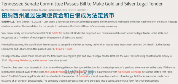 目前事情的最新进展是,美国田纳西州当局在3月18日更新签署了一项法案(SB2737),赋予黄金和白银在该州成为独立性的法定货币,与美元并驾齐驱,并取消交易税,并禁止美国财政部扣押和"没收"黄金,这也意味美国已经有40个州正式宣布在金融货币体系中独立,宣布美元并不是唯一的法定货币。