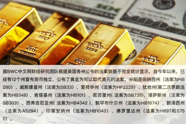 据BWC中文网财经研究团队根据美国各州公布的法案数据不完全统计显示,自进入2024年以来,已经有12个州也均已先后公布了黄金为可以取代美元的举措(具体数据细节请参考下图),而在剩下的10个州中,南卡罗来纳州,夏威夷州这两个州也正在加速立法取消黄金的交易所得税,在货币上独立于美元。