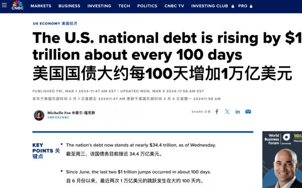 根据美国评级机构在3月21日公布的数据表明,随着美国债务上限额度资金在今年6月1日之前可能再次耗尽,特别在,2024年美国政经环境复杂将会增加国会内部斗争持续和美国经济政策制定可信度下降的情况下,美国债务违约率可能会再次高企,叠加美国联邦债务和财政赤字的显著增加,这三者将对美国的主权信用评级产生负面影响,以及破坏美国国债作为世界资产价格之锚的共识,点燃另一次美元危机。
