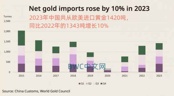 据世界黄金协会在3月19日更新发布的最新数据,2024年1月,全球央行黄金储备增加39吨,使得全球官方黄金储备飙升至35,938.6吨,其中,自2023年至今,中国是全球央行中最大的黄金买家,中国共进口黄金1420吨,进口量创下2015年以来最强劲年度表现。