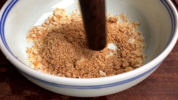 2.将两袋酥松的饼干捣碎,倒入无水无油的碗中,用擀面杖捣碎。