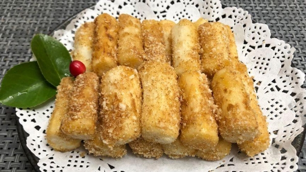 5.煮一勺清水和一勺白糖,使糖融化并熬制起泡泡,直到变得浓稠。将山药条倒入糖浆中,迅速翻炒均匀,让每个山药条都均匀裹上糖浆。然后将它们倒入饼干碎中,用饼干碎均匀地裹上糖浆。将山药条整齐地摆放到盘中,装饰一下,即可上桌。