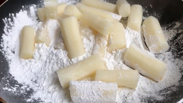 3.准备大碗,加入红薯淀粉或淀粉,然后将山药段一个一个放进来,让它们均匀地裹上一层淀粉。