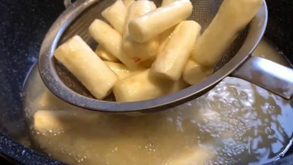 4.起锅加油,油要多一些,但不要太热。用一个山药条测试油温,当它快速冒泡泡时,可以将山药条一个一个放入炸。不要立刻动它们,等到它们定型后,再用铲子轻轻推动,防止粘锅底。炸大约两分钟左右,直到表面微微发黄。