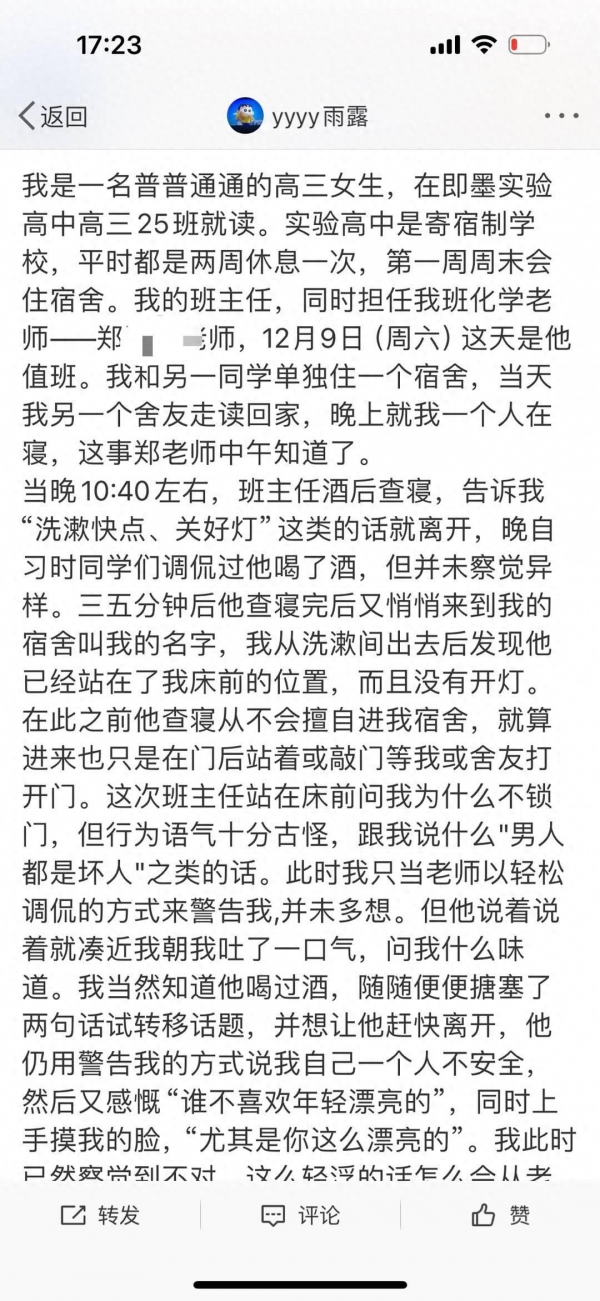 小雨就读的即墨实验高中实行寄宿制,她与另一名同学同住。据小雨描述,12月9日晚,室友走读回家,班主任郑某某在酒后查寝时,对她说了"男人都是坏人""今晚要惩罚你"之类的话,并用手摸她的脸,对她进行搂抱。幸运的是,宿舍阿姨似乎听到了寝室内的异常声响,及时出现在宿舍门口并打开了走廊灯,这才让郑某某逃离了现场。