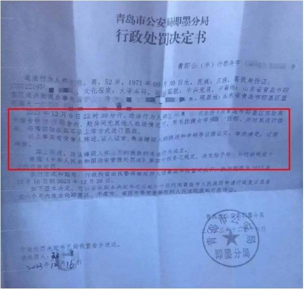 12月16日,小雨发布了一份青岛市公安局即墨分局的行政处罚决定书。决定书中提到,违法行为人郑某某,52岁。2023年12月9日22时30分许,违法行为人郑某某在青岛市即墨区实验高中宿舍,趁房间无其他人在场情况下,用手抚摸女学生脸部,并对其进行搂抱,将嘴贴在其耳朵上等方式进行猥亵。以上事实有受害人陈述,证人证言,违法嫌疑人的陈述和申辩等证据证实,事实清楚,证据确凿。