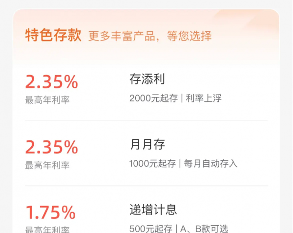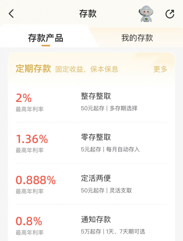 首先存款种类分为多种,有活期存款、定期存款、特色存款等,活期存款非常简单,利率只要0.2%,就不做过多赘述了。定期存款整存整取,最高利率为2%,零存整取的最高利率为1.36%,定活两便的最高利率为0.888%,还有通知存款的最高利率为0.8%,这几个产品都属于定期存款,共同的特点是固定收益,保本保息,相对来说选择的人也最多。