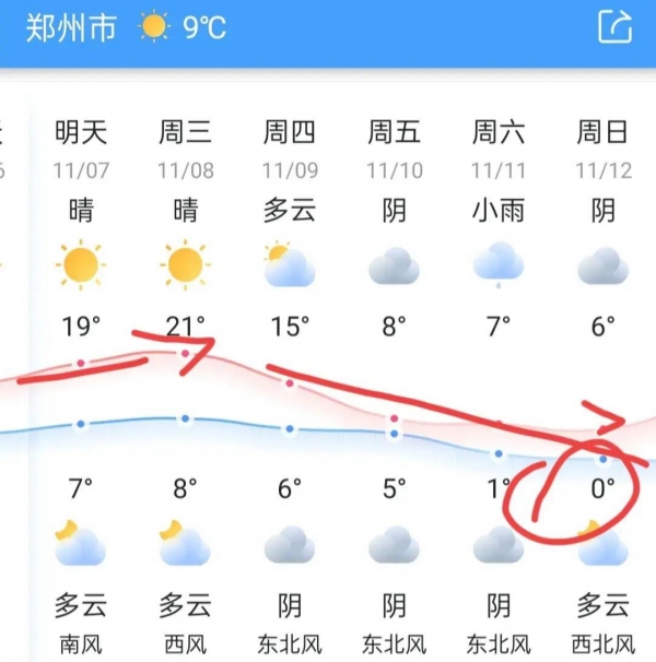 从11月9号开始,强冷空气将再次影响河南,气温将持续下降,最高温度将从21度降至6度,夜间温度将首次降至0度,开始出现结冰现象。