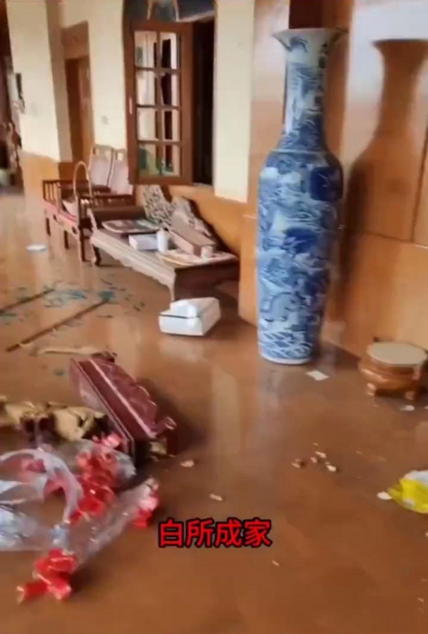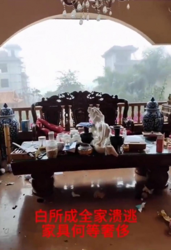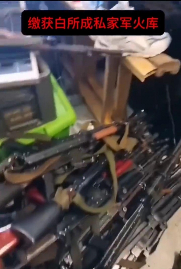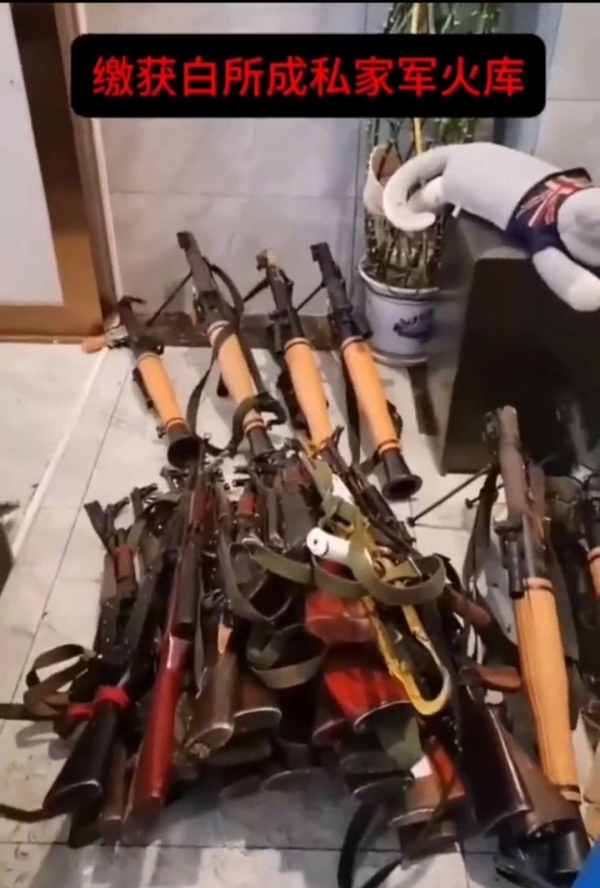 一段是,同盟军攻进了白所成的家,发现他家已经人去楼空,门窗破损,但屋内陈设基本完整,明显走得相当匆忙,被其视为荣誉的相片等物件都依旧挂在墙上,"泡的茶都没倒掉"。同盟军在他家中清点后,发现了不少古玩字画、翡翠、红木家具等,还有藏在军火库中大批军火,比如手枪、步枪和手雷等。