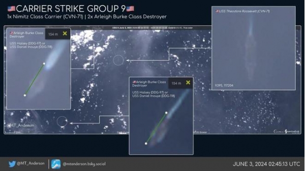 (卫星照片显示罗斯福号航母和两艘阿利伯克级驱逐舰位于金盾暗沙以南约100公里)