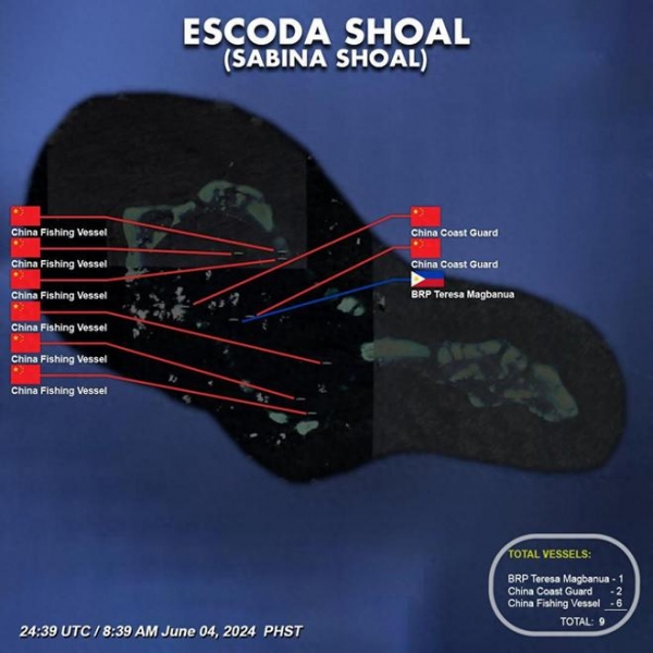 西方商业卫星拍到的最新照片显示,仙宾礁潟湖内共有中方6艘渔船和2艘海警船,而菲律宾方面仅有特雷莎•马格巴努亚号一艘船。几天前菲律宾方面曾经派出一艘较小的海警船停靠在特雷莎•马格巴努亚号边,对其进行补给。可以看出,菲律宾方面的"如意算盘"就是持续地派较小的船只对该船进行定期补给,以维持该船的长期停留。