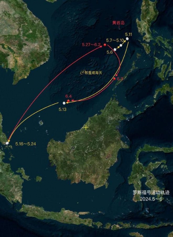 同时,卫星照片也显示,近期一直在黄岩岛以南海域徘徊的美国海军罗斯福号航母,紧随071登陆舰之后赶到了南沙群岛海域。6月3日罗斯福号航母已经抵达南沙群岛金盾暗沙以南约100公里处,随行的还有两艘阿利伯克级驱逐舰。大致测算,金盾暗沙距离仙宾礁海域在500公里以上,正在美军航母的舰载战斗机作战半径之内。因此罗斯福号航母打击群如果想要对我方舰艇保持威胁,可能会频繁出动舰载机。罗斯福号此番在南海的活动时间已远超以往,显示出美国军方嗅到了某种危险气息,所以不得不采取超常措施防止中方对菲律宾方面"动手"。