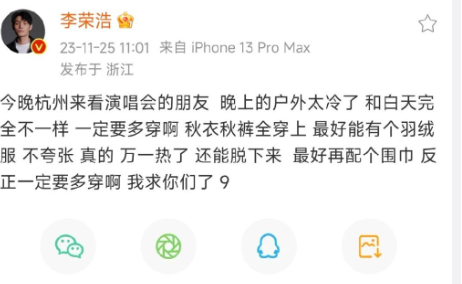 原来,李荣浩之所以连续发布十条"求求粉丝了"的微博,是因为他得知了杭州演唱会当晚户外气温将会下降的消息,他担心粉丝们会在户外等待演唱会开始时受冻,所以才连续发布微博提醒粉丝们注意保暖,多加衣物。