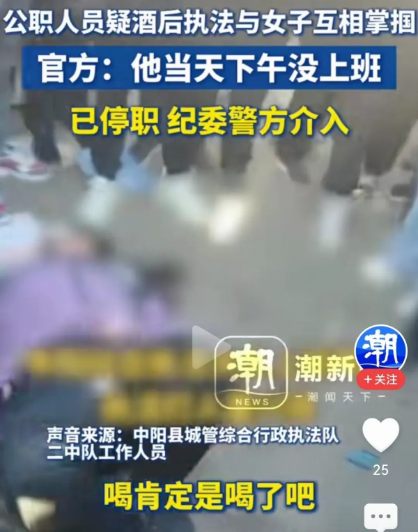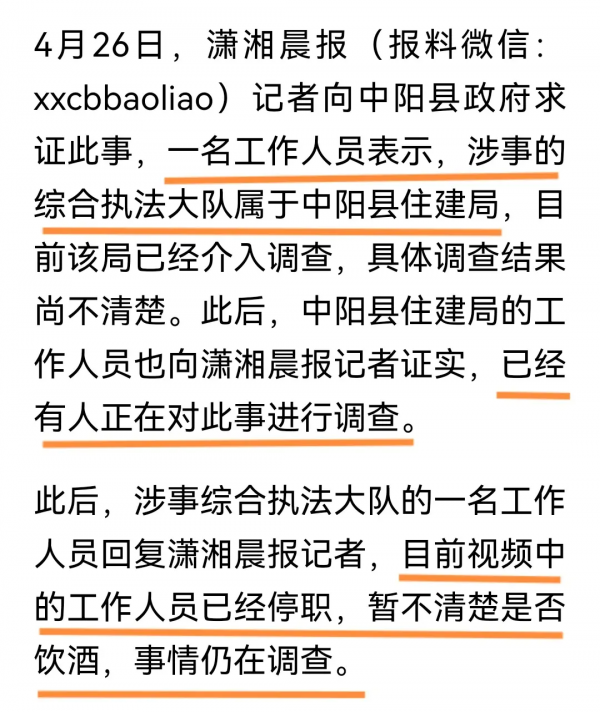 随后,有媒体报道称,涉事的综合执法大队属于中阳县住建局,该局正在调查,目前视频中的工作人员已经停职,暂不清楚是否饮酒。