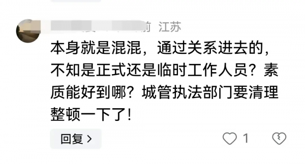 "本身就是混混通过关系进去的,不知是正式还是临时工作人员?素质能好到哪?城管执法部门要清理整顿一下了!"