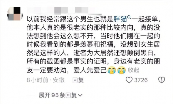 事情的开始,是男孩"胖猫"的姐姐发声,称自己的弟弟21岁,在与女方交往的两年多时间里,省吃俭用,拼命打单,只为赚钱给网恋女友花,甚至因为女友的一句不喜欢异地恋,从湖南独自来到重庆,最后却换来女友的分手,最终跳江自尽。
