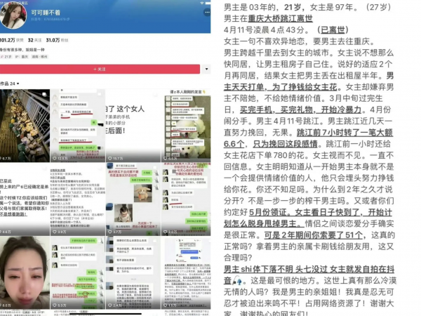 5月2日,一则"21岁男孩"胖猫"2年赚51万给网恋女友,结果被网恋女友pua,在重庆大桥跳江自尽"的消息冲上热搜。