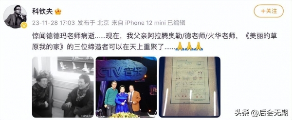 音乐人科钦夫在社交平台第一时间也公布了德德玛去世的消息,科钦夫在社交平台表示,听到德德玛老师逝世的消息也是比较突然、吃惊,现在德老师、火华老师和自己的父亲阿拉腾奥勒,《美丽的草原我的家》三位缔造者可以在天上重聚了。。。。