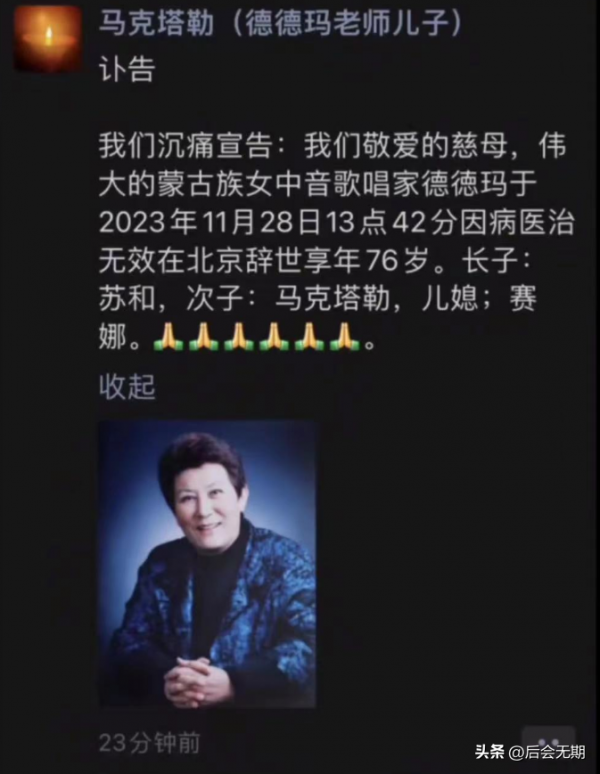 德德玛去世的消息公开后,马克塔勒也在朋友圈发布了母亲逝世的消息,因病医治无效在北京28日下午13点42分与世长辞。