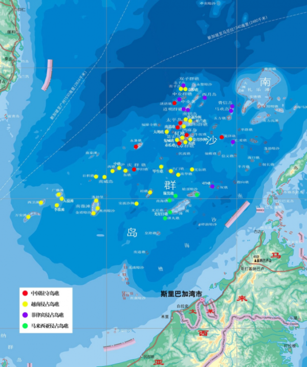 紫色小点标记的是菲律宾侵占的9个中国南海岛礁